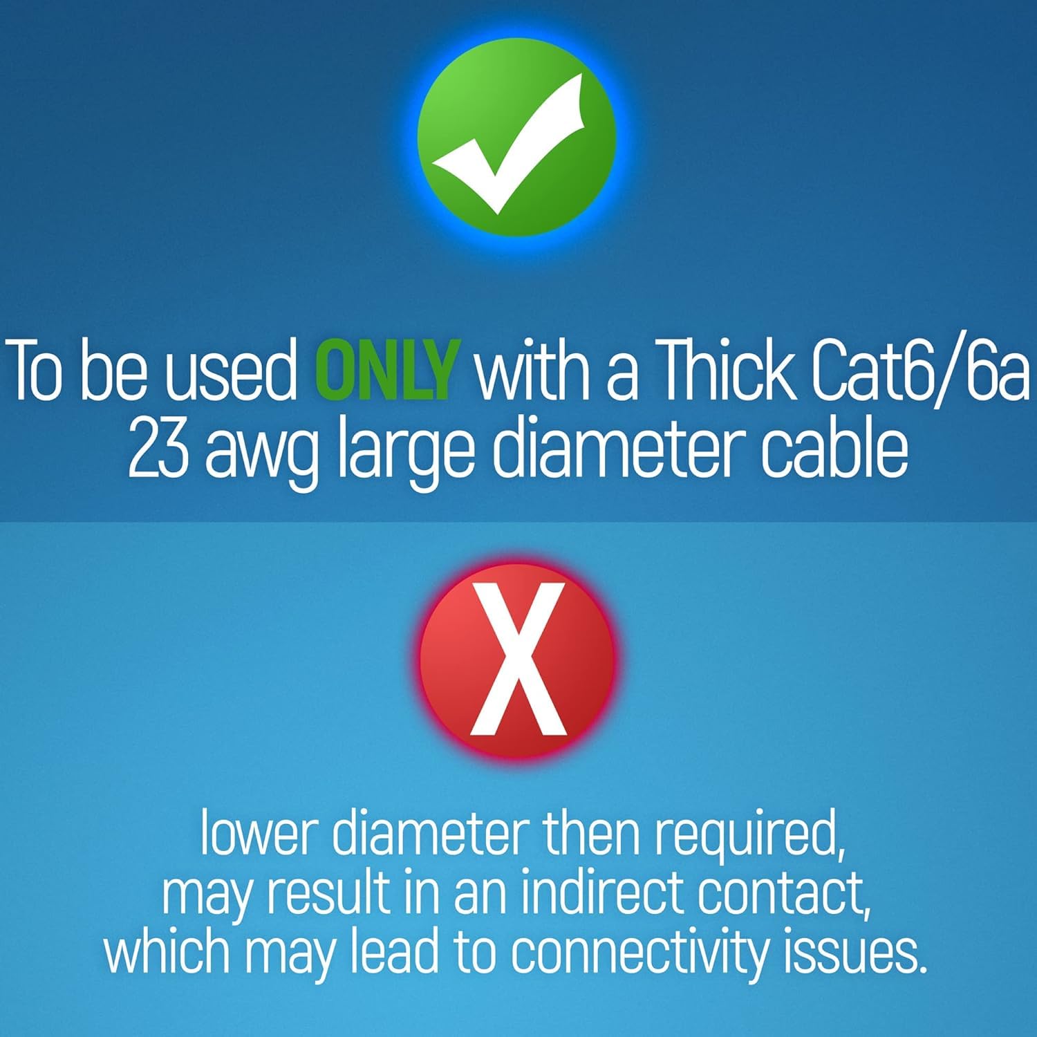 Built with 30µ gold‑plated contacts, these connectors deliver superior conductivity and long‑term corrosion resistance. The durable polycarbonate housing is UL‑94‑V2 flame rated and fully CE & RoHS compliant, making them suitable for both residential and commercial installations. Designed specifically for 23AWG solid and stranded Cat6A cable up to 1.1mm conductors, they provide reliable support for 10‑Gigabit Ethernet, PoE, and PoE+ applications.