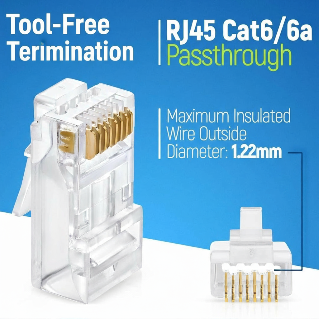 - Category: Cat6A RJ45 pass‑through (Unshielded, UTP)